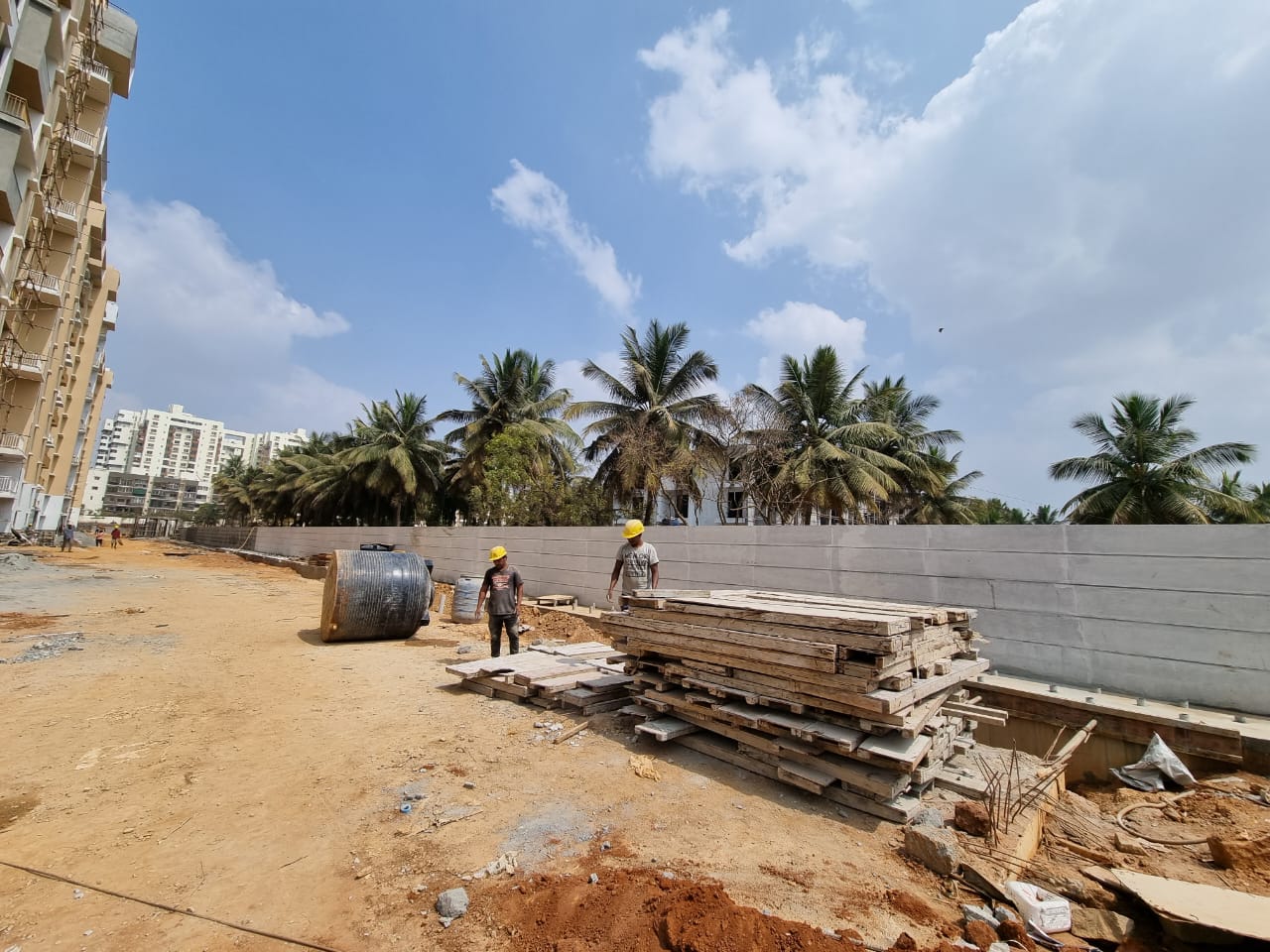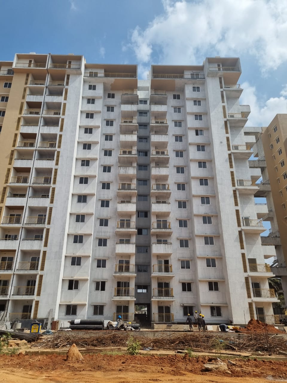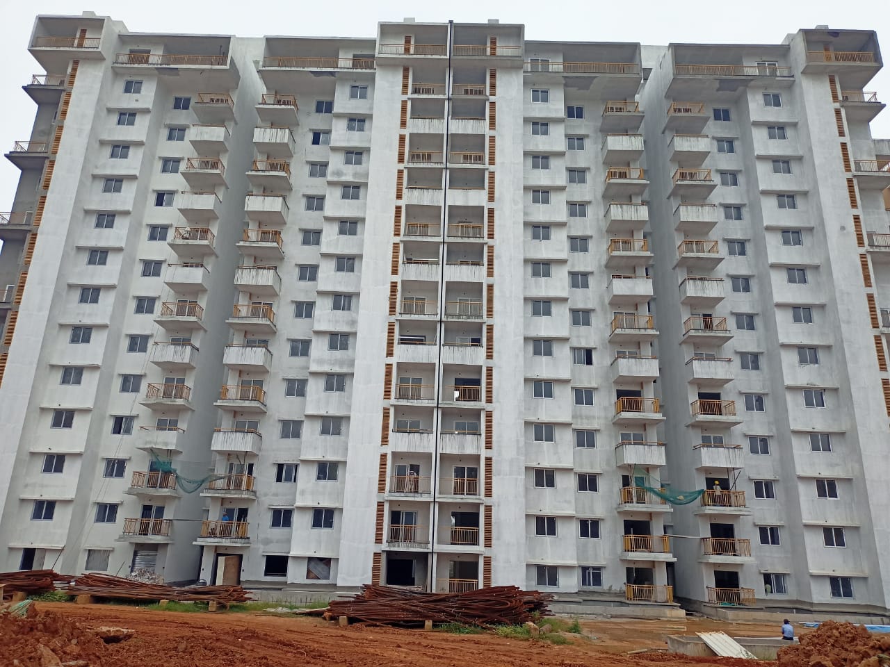 Tower F – Slab Work: Completed. Block Work : Completed. Internal Plastering: Completed. External Plastering: 93% Completed. External Painting: Yet to Start. Plumbing Work: 93% Completed. Flooring: 1st Floor in Progress.